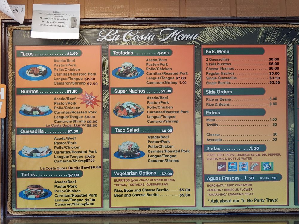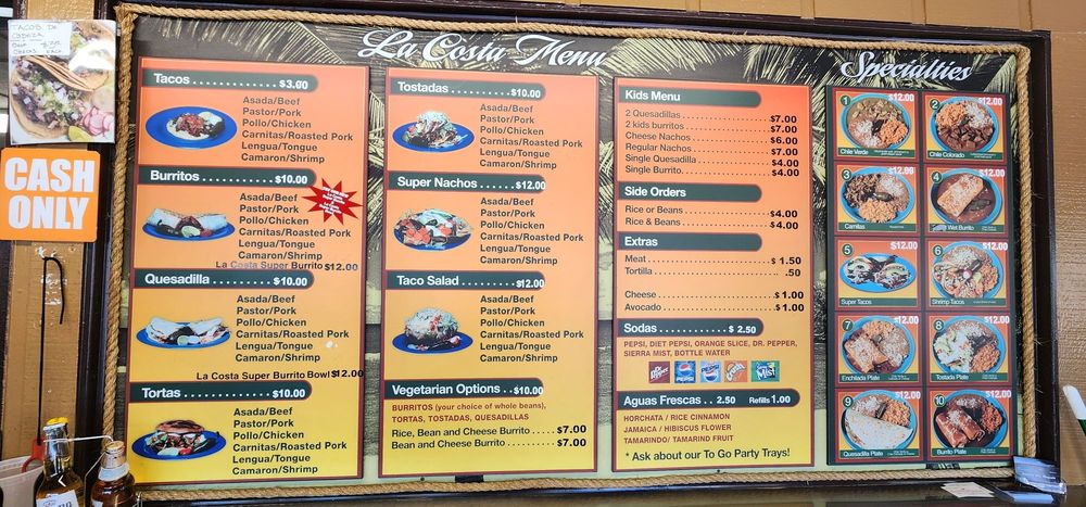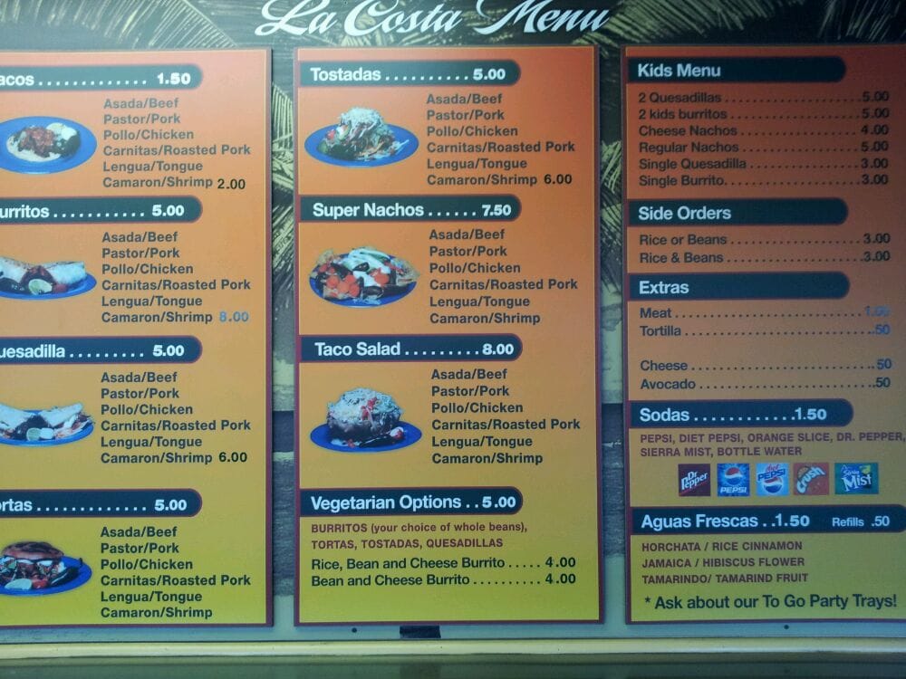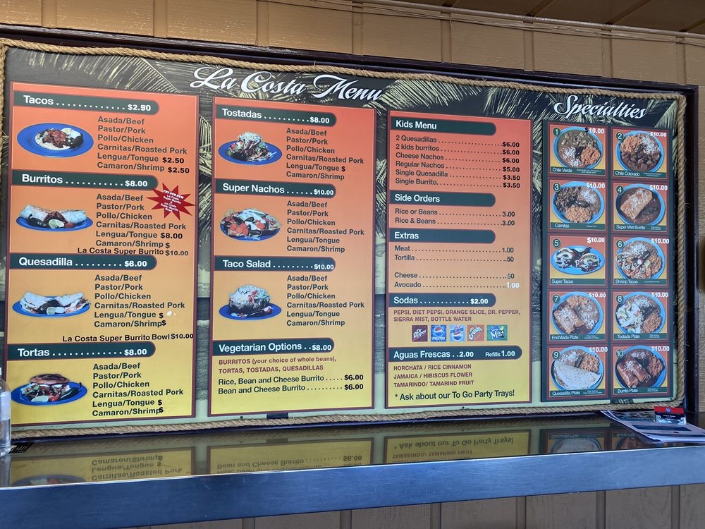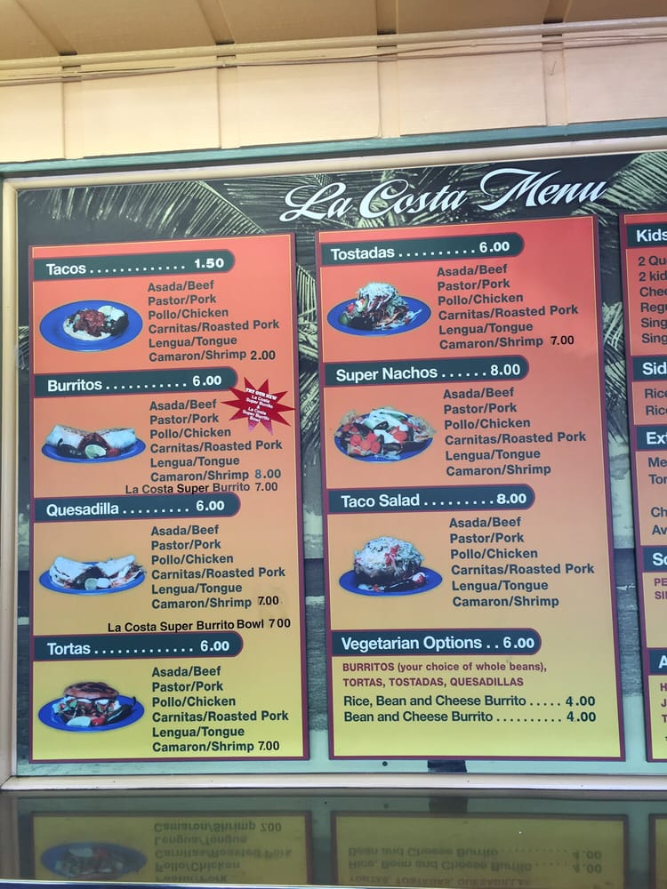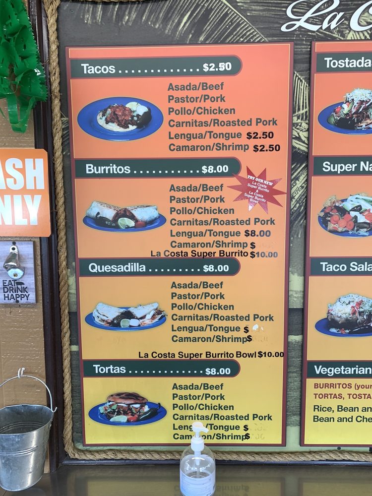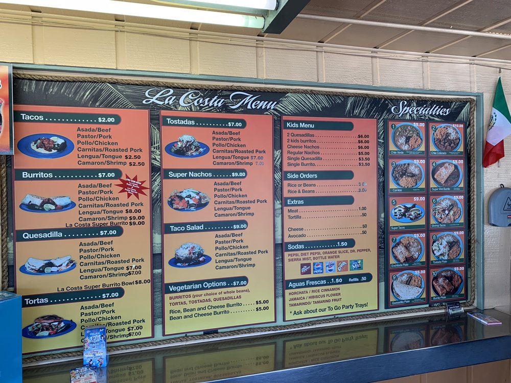 Introducing the menu at La Costa, a Mexican restaurant located in Brentwood. La Costa offers a variety of options, from tacos to burritos, with a focus on fresh and flavorful ingredients. Customers rave about the delicious shrimp tacos, juicy carne asada, and crispy carnitas. The menu features generous portions at great prices, making it a go-to spot for locals and visitors alike. With a charming mom-and-pop feel, La Costa provides a casual yet accommodating atmosphere for a quick and satisfying meal. While the restaurant primarily accepts cash, the convenient on-site ATM ensures smooth transactions. Don't miss out on the opportunity to experience the best Mexican food in Brentwood at La Costa.